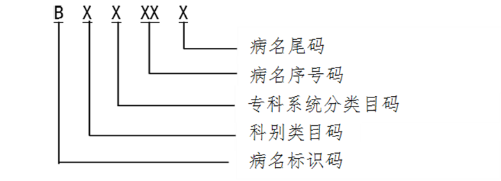 中医诊断编码使用“95国标”,包含中医病名和中医证候名编码,均为由阿拉伯数字和大写英文字母组成的6位码。中医病名和证候名编码结构见图3。