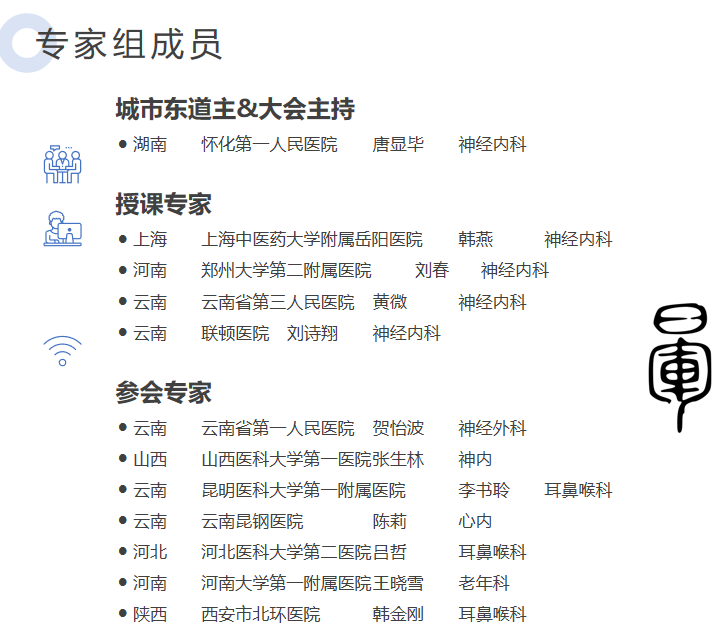 湖南省怀化市第一人民医院神经内科主任唐显毕教授作为城市东道主&大会主席出席本次会议,上海市中医药大学附属岳阳医院韩燕教授、郑州大学第二附属医院神经内科刘春岭教授、云南省第三人民医院神经黄微主任、云南联顿医院副院长刘诗翔教授出席授课,全国多位知名专家悉数到会。
