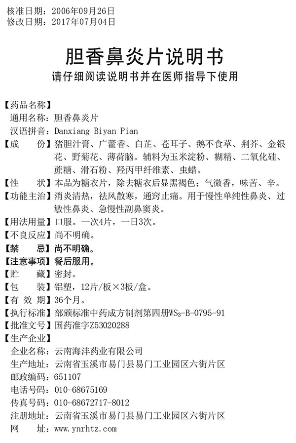 【通用名】胆香鼻炎片